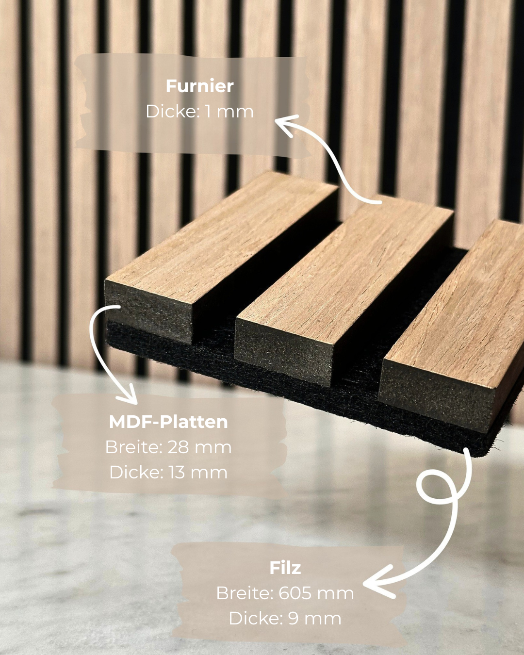 Filz absorbiert Schall, indem er Schallwellen in seiner offenen Faserstruktur aufnimmt, wodurch der Nachhall reduziert wird. Die Lamellen zerstreuen und diffundieren den Schall, insbesondere in Kombination mit einer Filzrückseite. Zusammen bieten sie eine effektive Lösung zur Verbesserung der Raumakustik.
